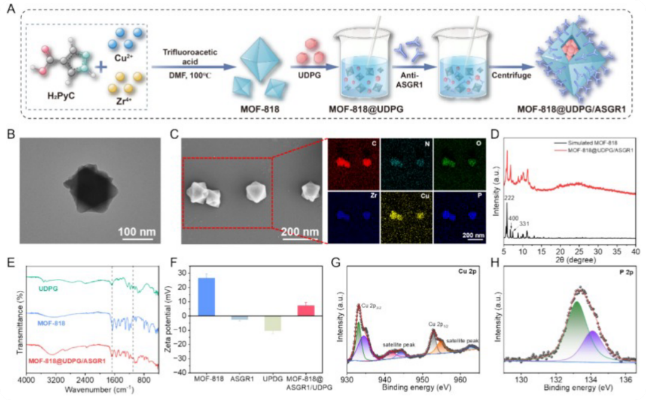 采用溶剂热法合成MOF-818,再负载UDPG并偶联ASGR1抗体,且观察到MOF-818 呈现规则的八面体结构,功能化后结构仍保持完整,粒径约为 133.2 nm(图2A-B)。元素映射证实C、N、O、Zr、Cu均匀分布,P 元素分布于表面(图2C)。XRD显示功能化后晶格结构保持完整(图2D)。FT-IR显示UDPG特征峰出现(图2E)。与MOF - 818相比,MOF-818 @ UDPG / ASGR1的Zeta电位显著降低,证明UDPG和ASGR1成功负载(图2F)。从多个维度全面验证了纳米酶的成功制备,证明其结构稳定、功能组分高效负载、具备良好胶体特性,为后续生物学实验提供了坚实的材料基础。