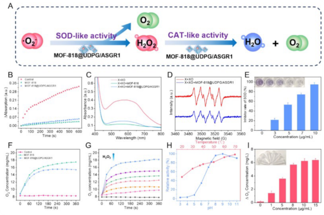 通过NBT还原实验和EPR波谱验证SOD活性,发现MOF-818@UDPG/ASGR1能有效清除超氧阴离子(图3A–E)。通过H₂O₂分解产O₂实验验证CAT活性,结果显示pH与温度稳定性良好(图3F–I)。这些数据表明,尽管经过功能化修饰,纳米酶依然保留强大的 SOD/CAT 双类酶活性,能够在病理环境中持续中和活性氧,是实现“抗氧化保护”的核心机制保障。